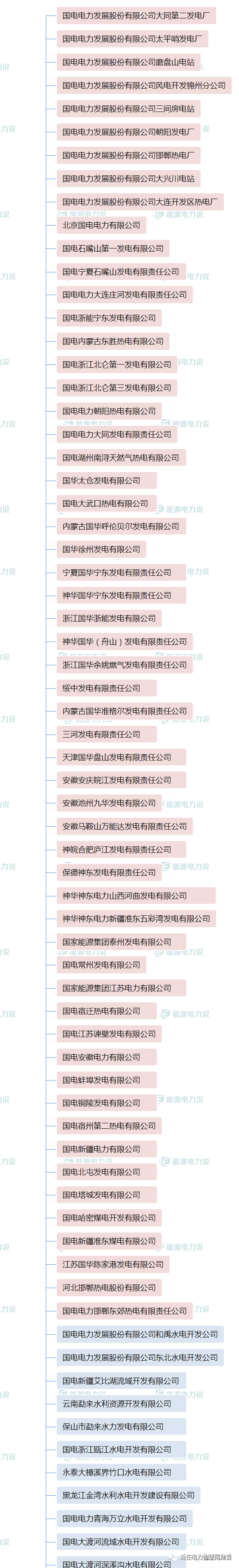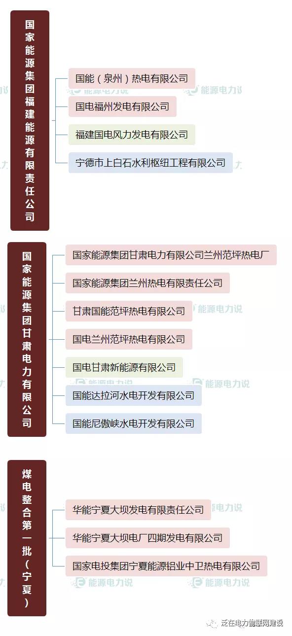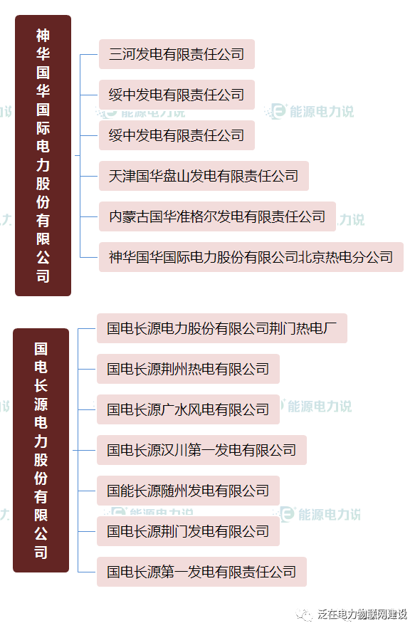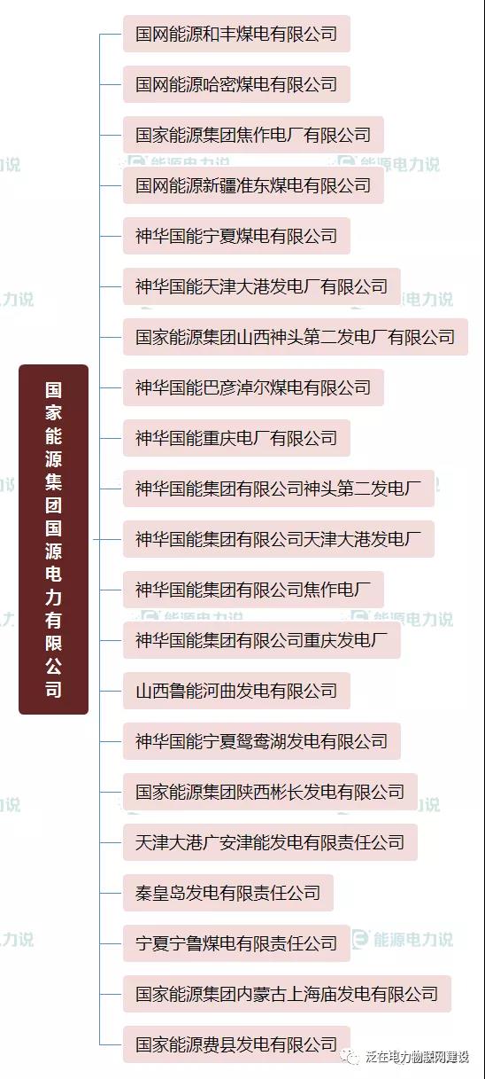 1.中国华能集团有限公司 中国华能集团有限公司(简称中国华能)是经国务院批准成立的国有重要骨干企业。 中国华能注册资本349亿元人民币,主营业务为:电源开发、投资、建设、经营和管理, 电力(热力)生产和销售,金融、煤炭、交通运输、新能源、环保相关产业及产品的开发、投资、建设、生产、销售,实业投资经营及管理。 多年来,公司坚决贯彻党中央决策部署,认真履行央企肩负的经济责任、政治责任和社会责任,秉承华能“三色公司”使命, 逐步形成了“电为核心、多能协同、创新引领、金融支持、全球布局, 加快建设‘三色三强三优’世界一流能源企业”的战略目标定位,为保障国家能源安全、推动能源转型升级、促进国民经济发展作出了积极贡献。 目前,公司拥有51家二级单位、460余家三级企业,5家上市公司(分别为华能国际、内蒙华电、新能泰山、华能水电、长城证券), 员工13万人。到2019年底,全资及控股电厂装机18278万千瓦,煤炭产能7760万吨/年。资产总额和金融管理资产规模均超过1万亿元,主要生产经营指标保持行业领先。在国内发电企业中率先进入世界500强,20次获得国资委业绩考核A级和央企负责人任期考核A级,在国内同类发电企业中次数最多。 “十三五”时期公司产业发展规划目标是:基本建成以电力为核心,煤炭、交通、金融、科技、物流和能源相关服务业相互协同, 国内国外协调发展的现代能源产业体系,各项主要指标进入世界同类能源企业前列,进入具有全球竞争力的世界一流企业行列。 2.中国大唐集团有限公司 中国大唐集团有限公司成立于2002年12月29日,是中央直接管理的国有特大型能源企业,主要业务覆盖电力、煤炭、金融、海外、煤化工、能源服务六大板块。中国大唐注册资本金370亿元,资产总额7726亿元,连续11次入选世界500强,连续8年在中央企业经营业绩考核中获得A级。 中国大唐实施以集团公司、分(子)公司、基层企业三级责任主体为基础的集团化管理体制和运行模式,所属企业包括5家上市公司、43家区域公司和专业公司,员工总数9.5万人。5家上市公司分别是首家在伦敦上市的中国企业、首家在香港上市的电力企业——大唐国际发电股份有限公司;较早在国内上市的大唐华银电力股份有限公司、广西桂冠电力股份有限公司;在香港上市的中国大唐集团新能源股份有限公司、大唐环境产业集团股份有限公司。 党的十九大以来,中国大唐坚持以习近平新时代中国特色社会主义思想为指导,全面贯彻党的十九大和十九届二中、三中、四中、五中全会精神,坚决贯彻党中央决策部署,树牢“四个意识”,坚定“四个自信”,做到“两个维护”,坚持新发展理念,坚持高质量发展,坚持稳中求进工作总基调,紧扣重要战略机遇期新内涵,紧抓深化供给侧结构性改革新机遇,以坚持党的领导、加强党的建设为保证,以改革创新为动力,转变发展方式,优化结构布局,深化提质增效,持续打好三大攻坚战,各方面工作取得新进展新成效。 中国大唐确立了建设世界一流能源企业的总目标和“干就干一流的事,干就干成一流”的总要求;提出了始终坚持胸怀大局服务全局、始终坚持和加强党的领导、始终坚持新发展理念、始终坚持矢志一流初心使命、始终坚持以人民为中心的发展思想的治企兴企基本方略;明确了国家战略实施者、行业发展领先者、清洁能源提供者、公司价值创造者、公共利益维护者的企业使命;大力推进质量、效率、动力“三个变革”,建设质量大唐、效率大唐、活力大唐、美丽大唐、幸福大唐。 中国大唐始终坚持新发展理念,坚决落实能源安全新战略,聚焦“风光气服”重点发展方向,加速推进国际化业务。截至2020年9月,在役发电装机规模1.55亿千瓦,其中清洁能源占36.4%,超低排放机组占煤电机组的比重超过97%,居行业先进水平。中国大唐在役及在建资产分布在全国31个省、直辖市、自治区和香港特别行政区,以及缅甸、柬埔寨、老挝、印尼等多个国家和地区。拥有世界在役最大火力发电厂——内蒙古大唐国际托克托发电公司、世界最大在役风电场——内蒙古赤峰塞罕坝风电场。 面向“十四五”,中国大唐紧密团结在以习近平同志为核心的党中央周围,科学把握新发展阶段,促进构建新发展格局,深入贯彻新发展理念,大力推进高质量发展,坚持创新核心地位,提升技术创新能力,培育新模式新业态,加快建设世界一流能源企业,为建成绿色、低碳、安全、高效现代能源体系,实现“两个一百年”奋斗目标、实现中华民族伟大复兴中国梦作出新的更大贡献。 4.中国国电集团公司 中国国电集团公司(英文:China Guodian Corporation)是经国务院批准,于2002年12月29日在原国家电力公司部分企事业单位的基础上组建的以发电为主的综合性大型电力集团、副部级大型央企 [1] 。中国国电集团公司主要从事电源的开发、投资、建设、经营和管理,组织电力(热力)生产和销售;从事煤炭、发电设施、新能源、交通、高新技术、环保产业、技术服务、信息咨询等电力业务相关的投资、建设、经营和管理;从事国内外投融资业务,自主开展外贸流通经营、国际合作、对外工程承包和对外劳务合作等业务。 2010年,公司入选世界500强企业,2014年,在世界500强排名大幅提升至297位。2016年8月,中国国电集团公司在"2016中国企业500强"中排名第81位。 [2] 2017年7