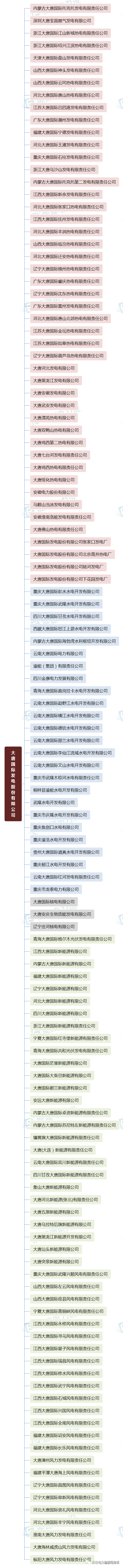 根据公开信息,大唐集团共统计出369家发电公司,其中火电131家,水电74家,光伏风电等新能源160家,核电生物质能等4家。具体情况如下:(▅为火电公司 ▅为水电公司 ▅为新能源发电公司)